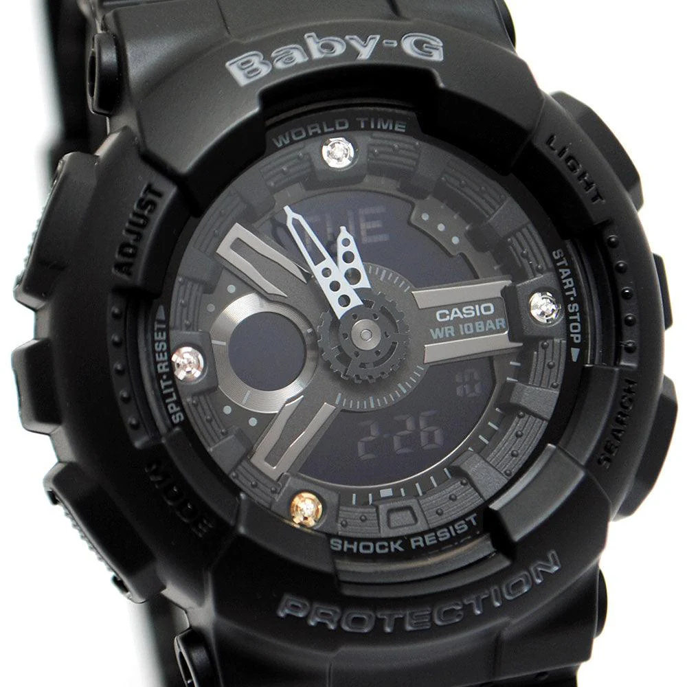 Baby-G 35th Anniversary Genuine Diamond Index Limited Edition. This timepiece pair is made up of the G-SHOCK GA-110 big case model and the G-SHOCK inspired BABY-G BA-110. Both models combine various large parts into complex patterns, and incorporate diamonds into their designs. The color of both models is basic black, and diamonds at 12, 3, 7, and 9 o'clock add a chic touch of brilliance. The metal ring around the diamond at 7 o'clock has a gold ion-plated (IP) finish as does the back covers, to identify these watches as G-SHOCK 35th Anniversary models.