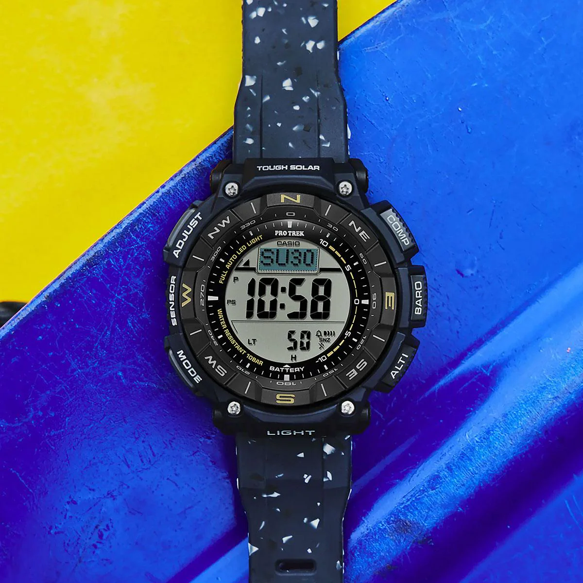 Go bold and bright. Get out and explore the great outdoors! Get the PRO TREK fPRG-340SC with dual-layer LCD, featuring environmentally responsible materials. This is the first PRO TREK timepiece with a Dura Soft band made from reused resin scraps left over from manufacturing processes. In keeping with the PRO TREK commitment to reducing environmental impact by using sustainable materials, reused resin scraps are an excellent complement to a line of watches. Taking its cue from the PRG-340, key components for the case, rotating bezel, and case back are made with bio-based resin. Produced using renewable organic resources, this material is another way to help reduce environmental impact.