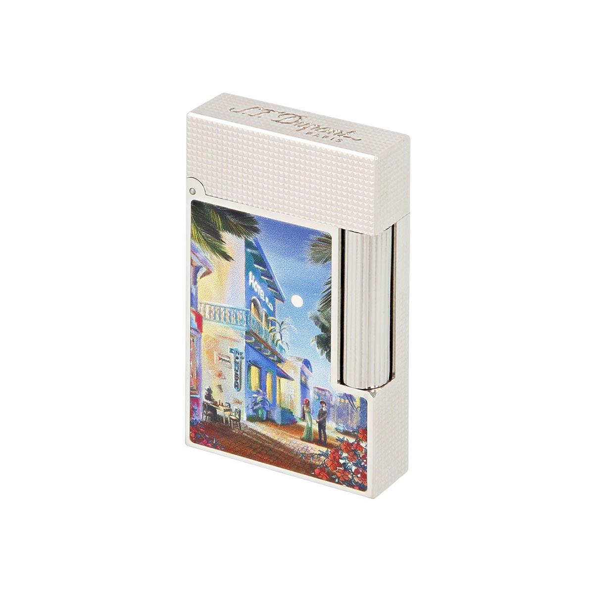 Inspired by the vibrant streets of Cuba, the Ligne 2 Cuba Limited Edition lighter sets the perfect mood for lighting a cigar. This classic Ligne 2 model features a platinum-plated micro diamond head finish, signature "Cling" sound, and a soft, adjustable double flame. Using S.T. Dupont's printed lacquer technique, colourful Cuban scenes are brought to life through hand-applied layers of natural varnish, creating a pearl-like shimmer and a durable, fire-resistant finish. The micro diamond head engraving on the top and sides complements the vivid design, while the S.T. Dupont logo and 24-line grooved ignition wheel ensure both elegance and functionality.